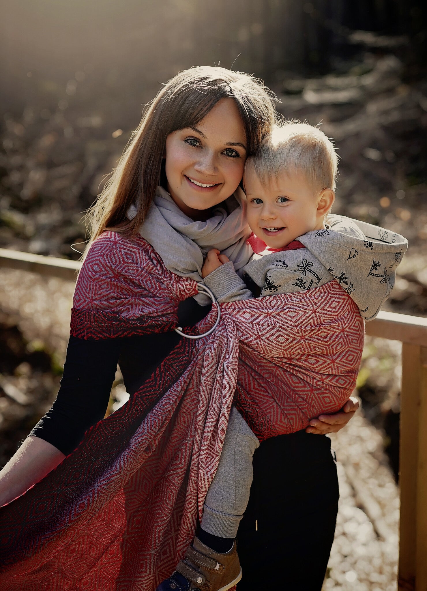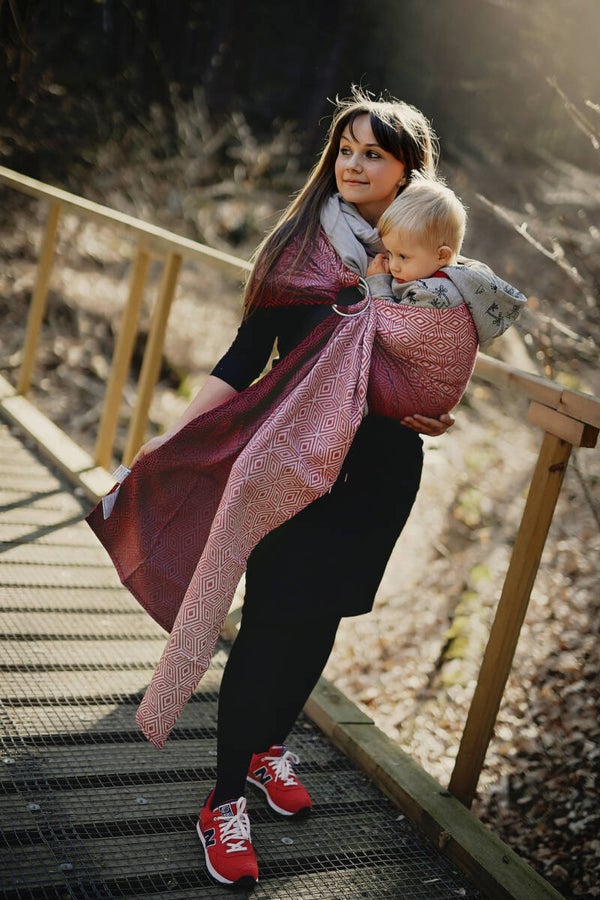 Een ringsling is de ideale doek voor in huis of als je even een boodschap wil doen. Je kunt je kindje er snel in en uit doen zonder te knopen. Door de doek aan te spannen met gebruik van twee ringen ben je supersnel klaar! Je kunt je kindje vanaf de geboorte tot ver in de peutertijd in een ringsling dragen. Een ringsling draag je altijd over één schouder en is daarom wel minder geschikt om lang achter elkaar te gebruiken.